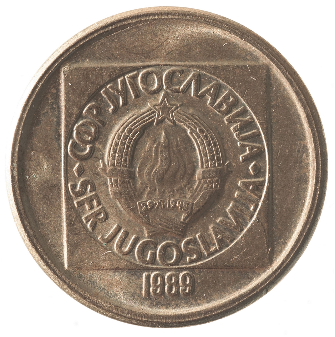 U sredini unutar četverokuta državni grb, a oko njega uz rub polukružno napisan tekst SFR JUGOSLAVIJA na latinici i ćirilici. Ispod godina 1989.