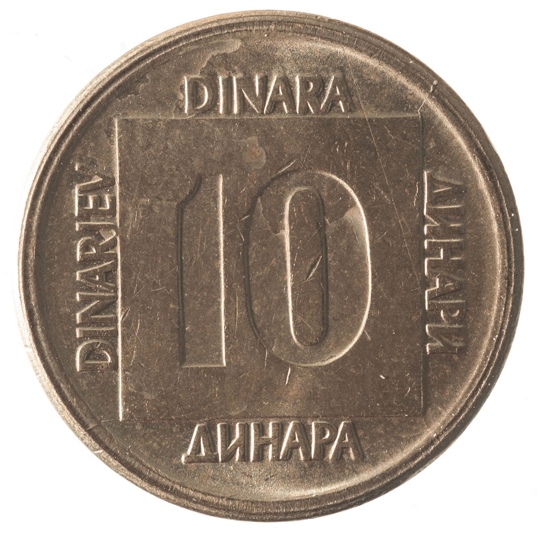 U sredini četverokuta broj 10 (nominala), oko njega tekst DINAR na četiri jezika.