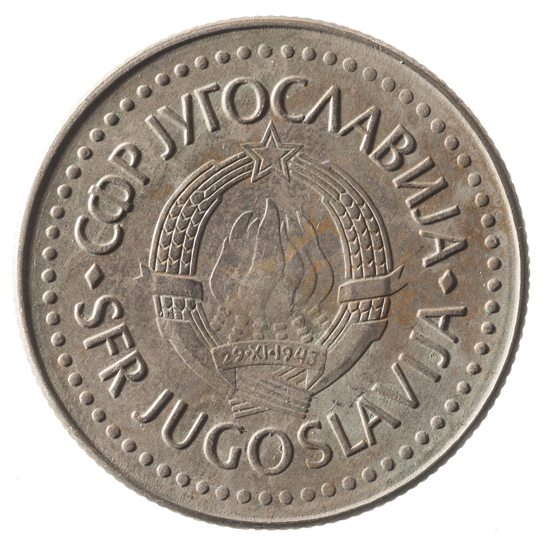 U sredini državni grb. Oko njega uz rub polukružno napisan tekst SFR JUGOSLAVIJA na latinici i ćirilici.
