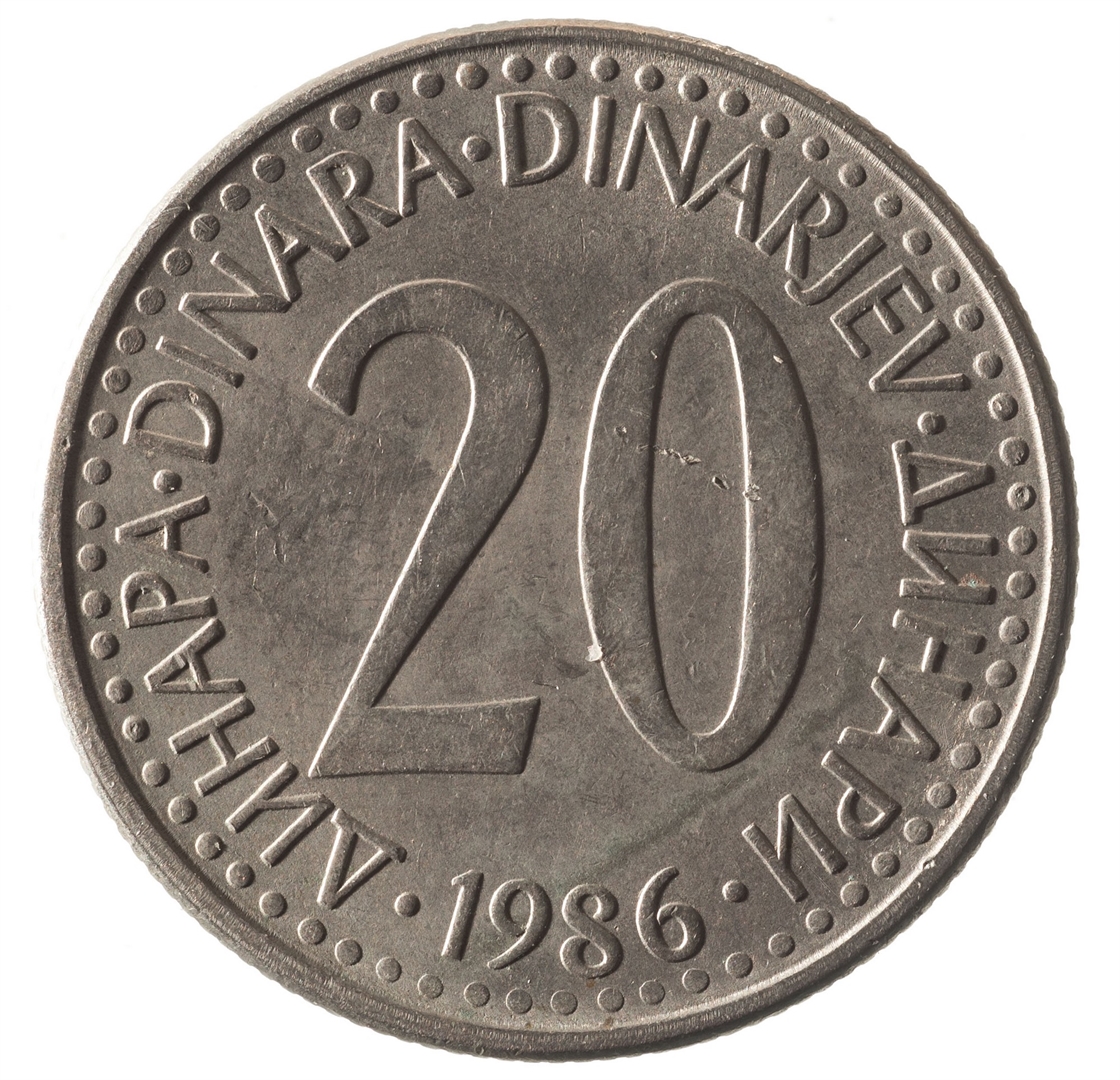 U sredini broj 20 (nominala), oko njega tekst DINAR na četiri jezika, a ispod toga godina 1986.