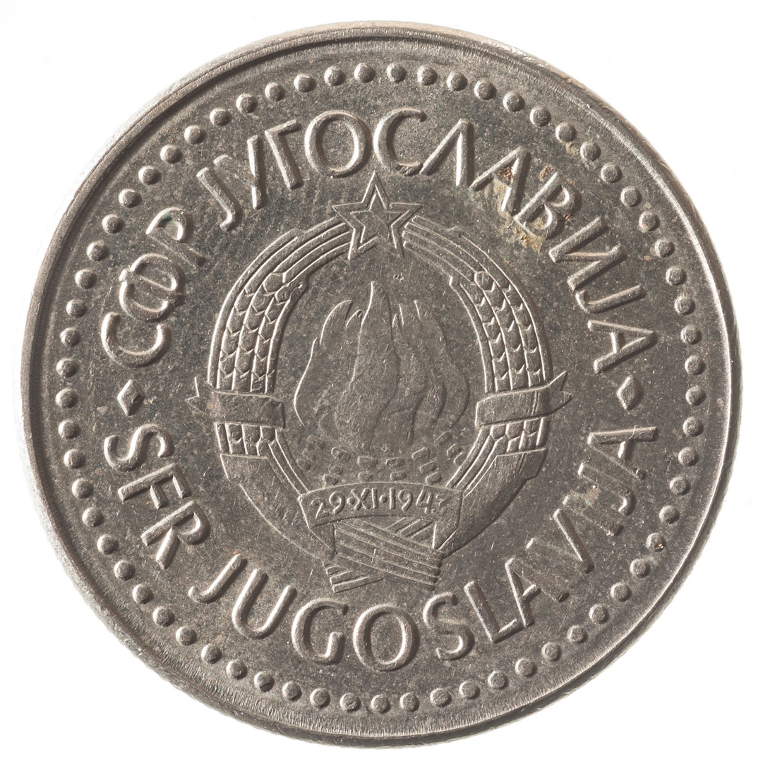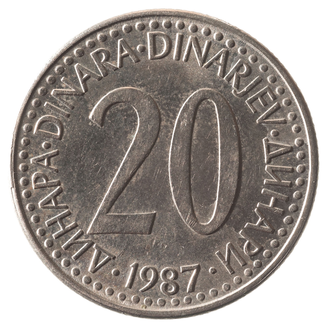Avers: U sredini državni grb. Oko njega uz rub polukružno napisan tekst SFR JUGOSLAVIJA na latinici i ćirilici. Revers: U sredini broj 20 (nominala), oko njega tekst DINAR na četiri jezika, a ispod toga godina 1987.