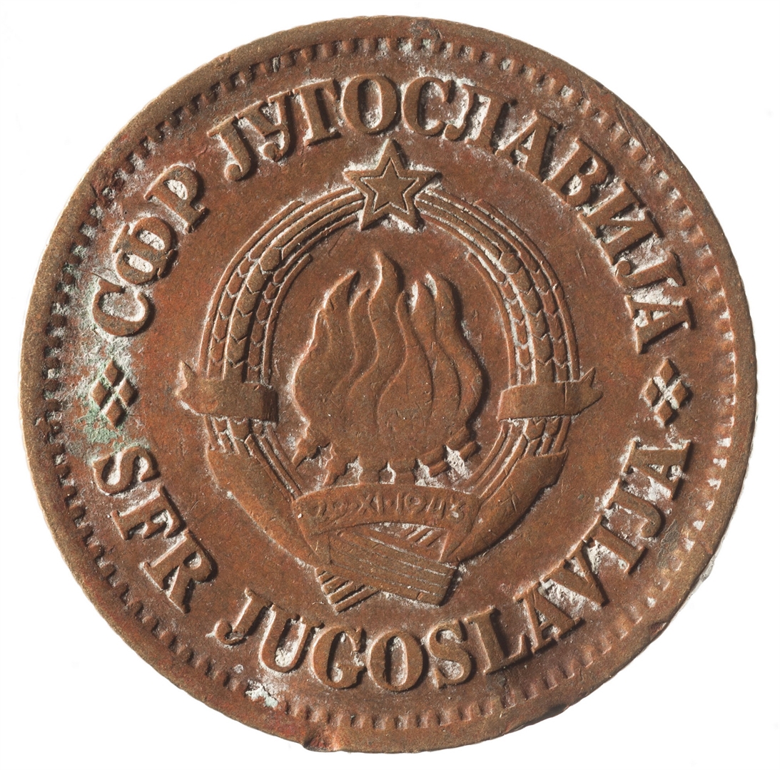 U sredini državni grb. U gornjem djelu uz rub polukružno napisan tekst SFR JUGOSLAVIJA na latinici i ćirilici.