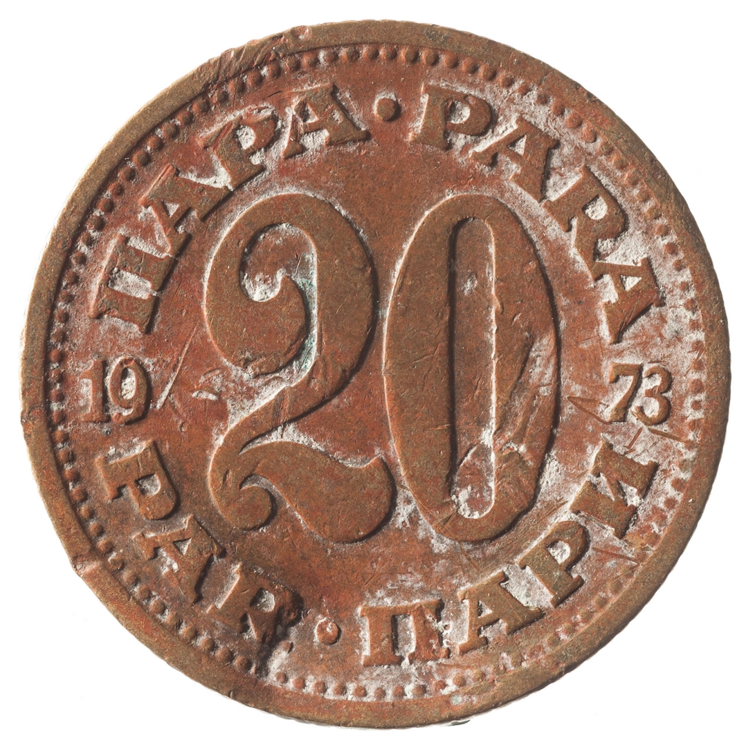 U sredini broj 20 (nominala), a oko njega tekst PARA na četiri jezika. U sredini uz lijevi i desni rub upisana godina 1973.