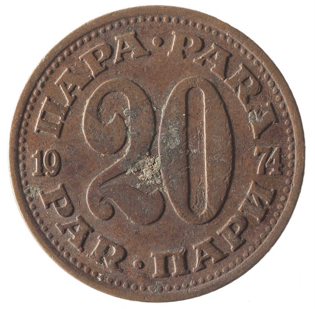 U sredini broj 20 (nominala), a oko njega tekst PARA na četiri jezika. U sredini uz lijevi i desni rub upisana godina 1974.