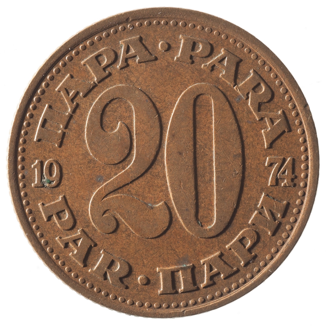 U sredini broj 20 (nominala), a oko njega tekst PARA na četiri jezika. U sredini uz lijevi i desni rub upisana godina 1974.
