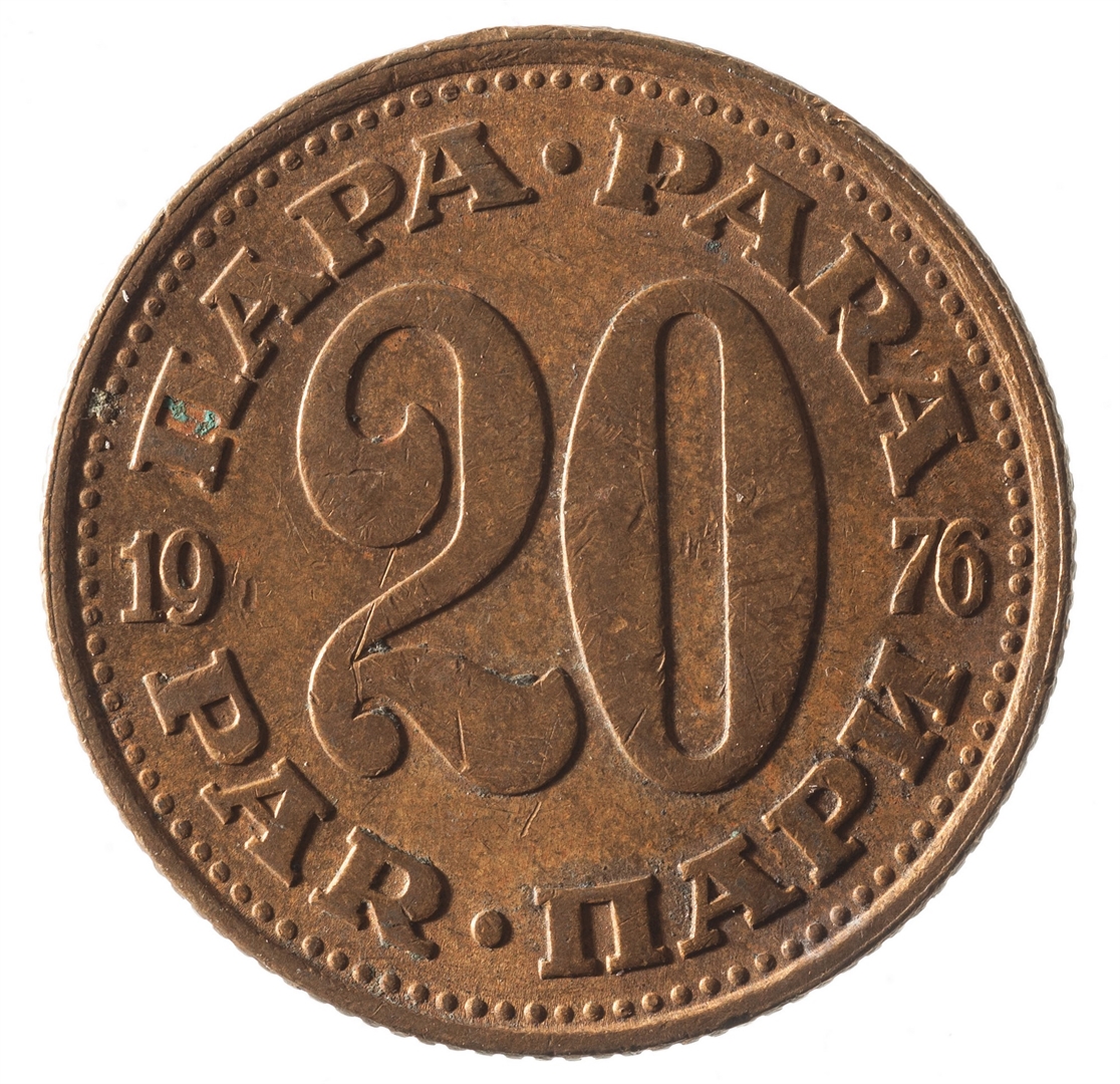 U sredini broj 20 (nominala), a oko njega tekst PARA na četiri jezika. U sredini uz lijevi i desni rub upisana godina 1976.