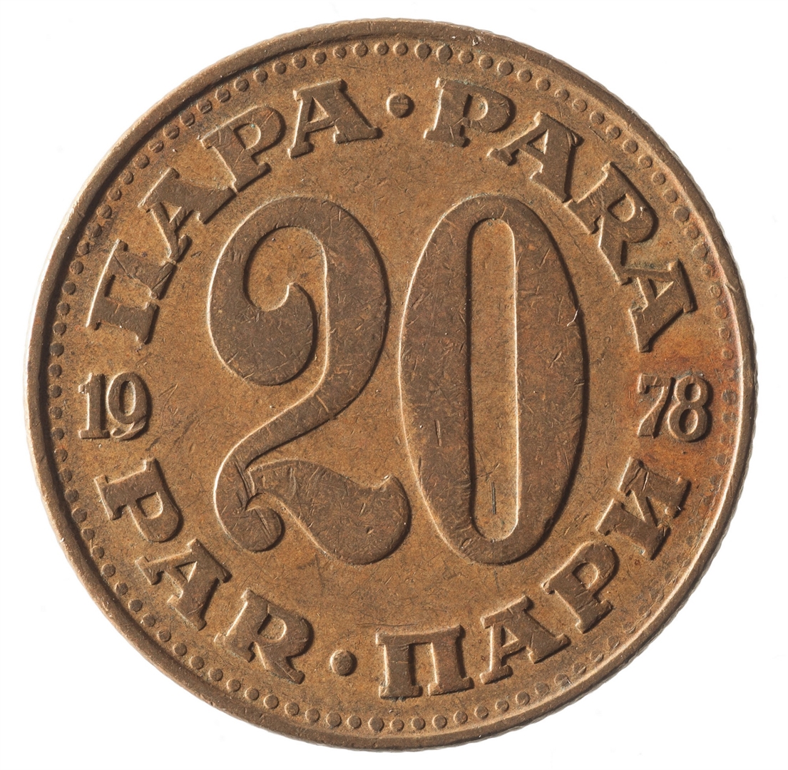 U sredini broj 20 (nominala), a oko njega tekst PARA na četiri jezika. U sredini uz lijevi i desni rub upisana godina 1978.