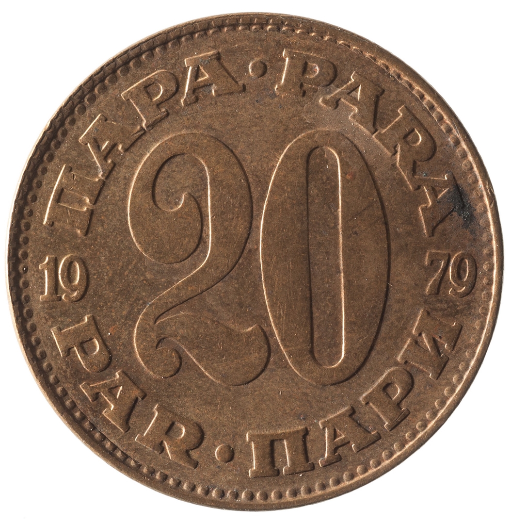U sredini broj 20 (nominala), a oko njega tekst PARA na četiri jezika. U sredini uz lijevi i desni rub upisana godina 1979.