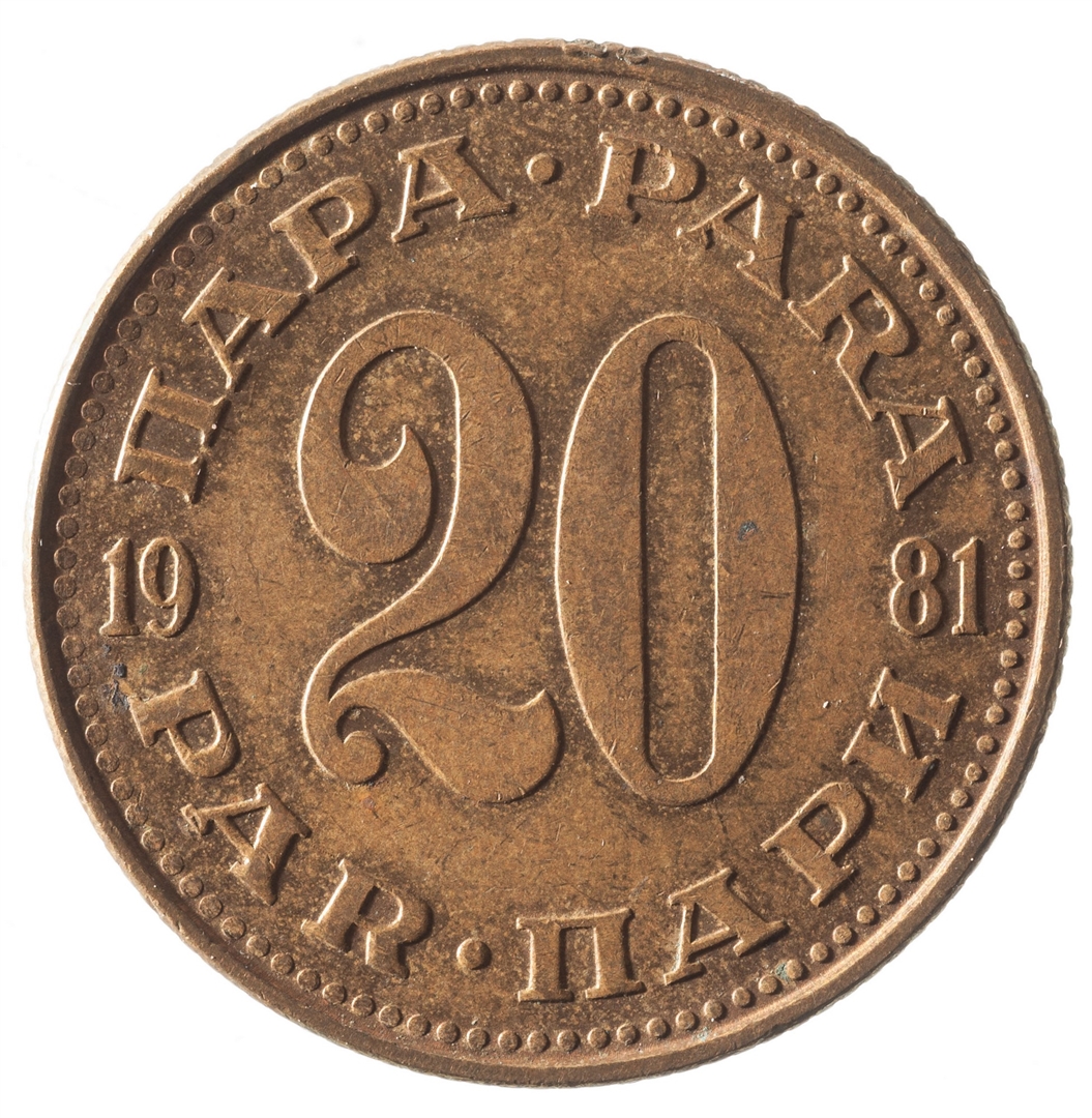 U sredini broj 20 (nominala), a oko njega tekst PARA na četiri jezika. U sredini uz lijevi i desni rub upisana godina 1981.