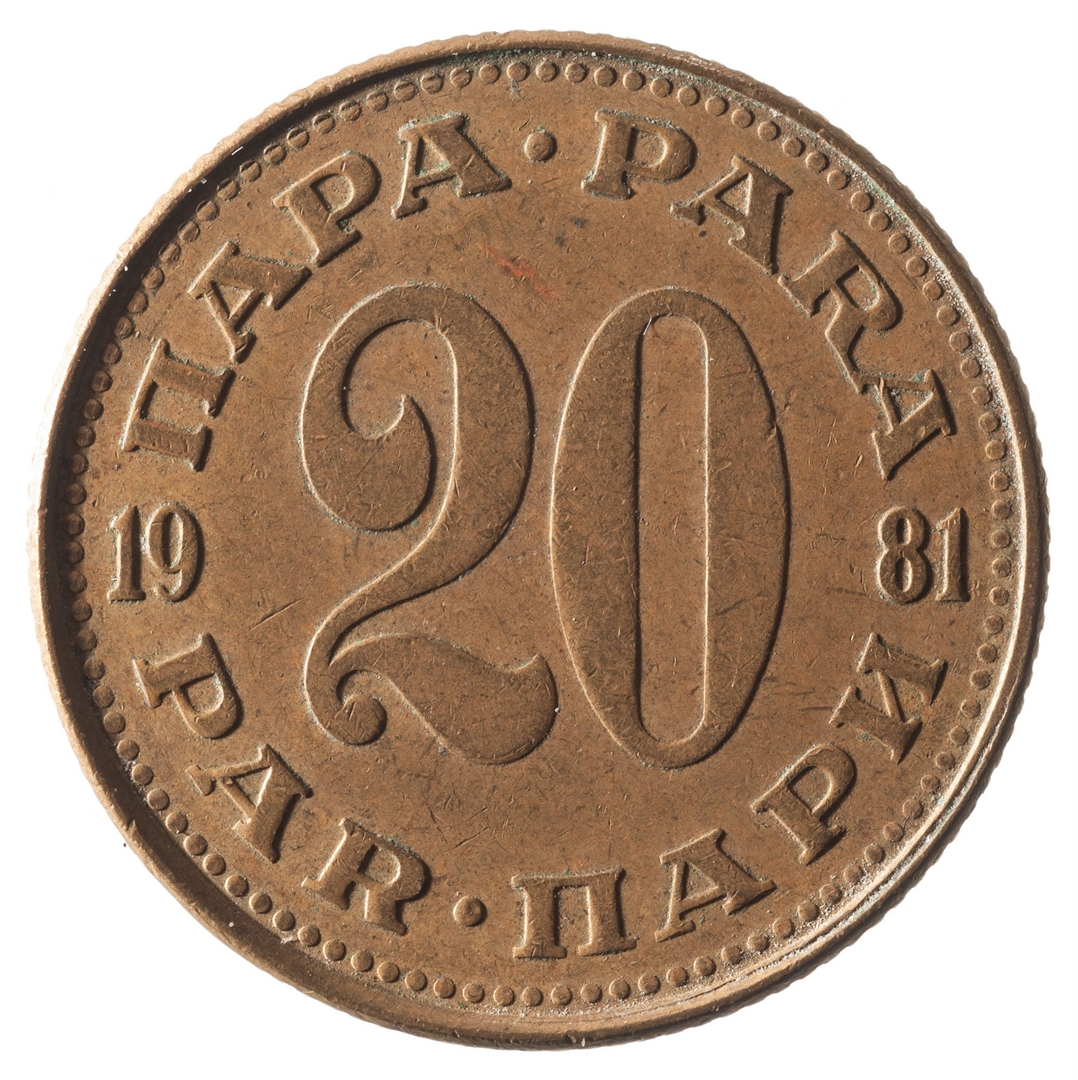 U sredini broj 20 (nominala), a oko njega tekst PARA na četiri jezika. U sredini uz lijevi i desni rub upisana godina 1981.