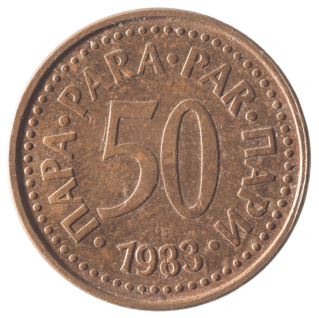 U sredini broj 50 (nominala), oko njega tekst PARA na četiri jezika, a ispod toga godina 1983.