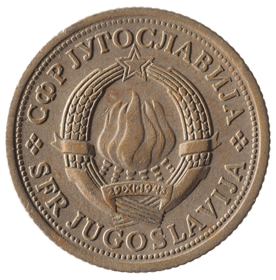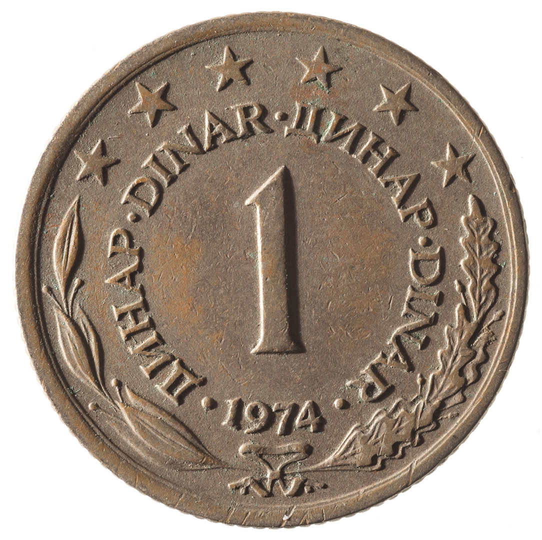 U sredini broj 1 (nominala), oko njega tekst DINAR na četiri jezika, a ispod toga godina 1974. Duž gornjeg ruba polukružno poredano 6 petokrakih zvjezdi.