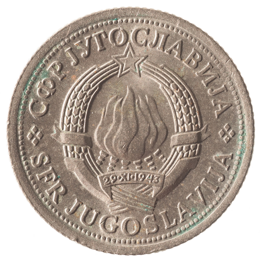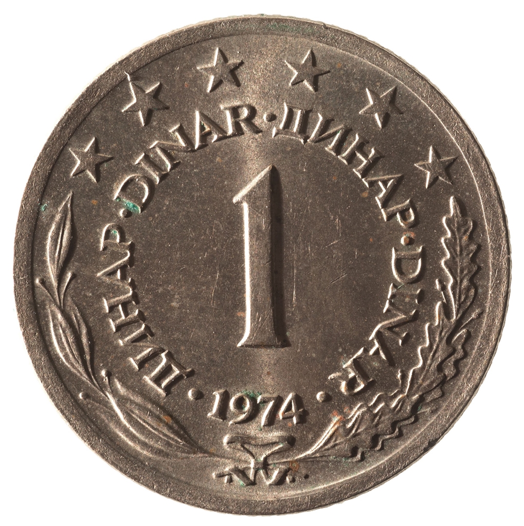 U sredini broj 1 (nominala), oko njega tekst DINAR na četiri jezika, a ispod toga godina 1974. Duž gornjeg ruba polukružno poredano 6 petokrakih zvjezdi.
