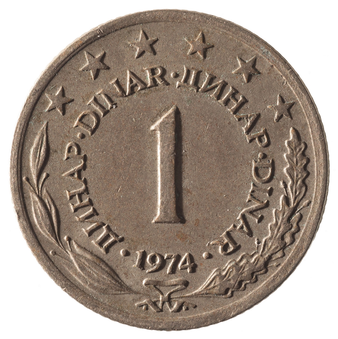 U sredini broj 1 (nominala), oko njega tekst DINAR na četiri jezika, a ispod toga godina 1974. Duž gornjeg ruba polukružno poredano 6 petokrakih zvjezdi.