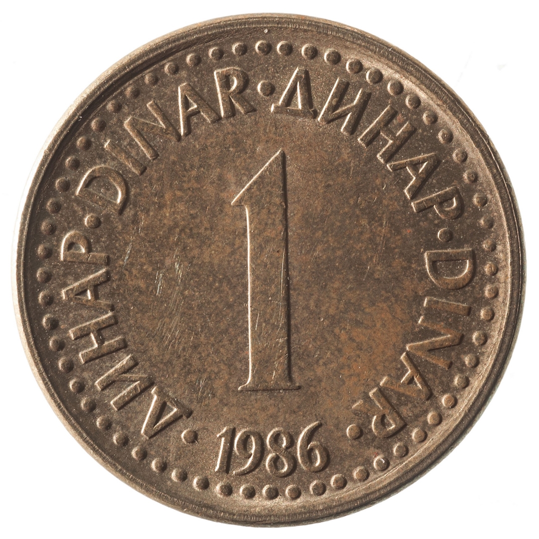 U sredini broj 1 (nominala), oko njega tekst DINAR na četiri jezika, a ispod toga godina 1986.
