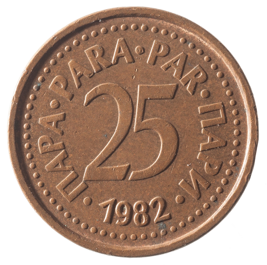 U sredini broj 25 (nominala), oko njega tekst PARA na četiri jezika, a ispod toga godina 1982.