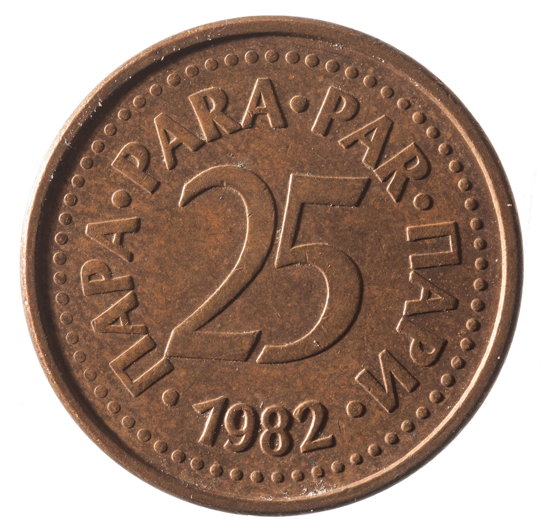 U sredini broj 25 (nominala), oko njega tekst PARA na četiri jezika, a ispod toga godina 1982.