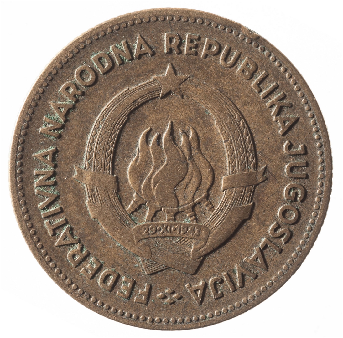 U sredini državni grb. U gornjem djelu uz rub polukružno napisan tekst FEDERATIVNA NARODNA REPUBLIKA JUGOSLAVIJA.