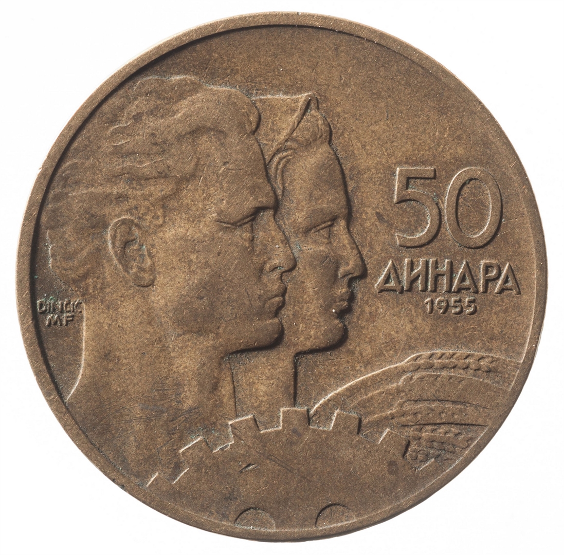 Prikaz seljanke koja drži žito i radnika uz stroj u profilu.Uz rub broj 50 (nominala), a ispod njega tekst DINARA na ćirilici i godina 1955.