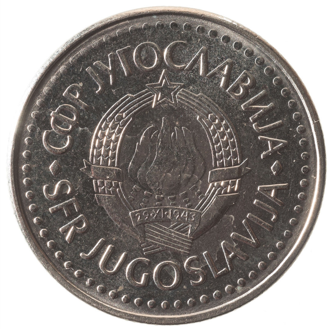 U sredini državni grb. Oko njega uz rub polukružno napisan tekst SFR JUGOSLAVIJA na latinici i ćirilici.