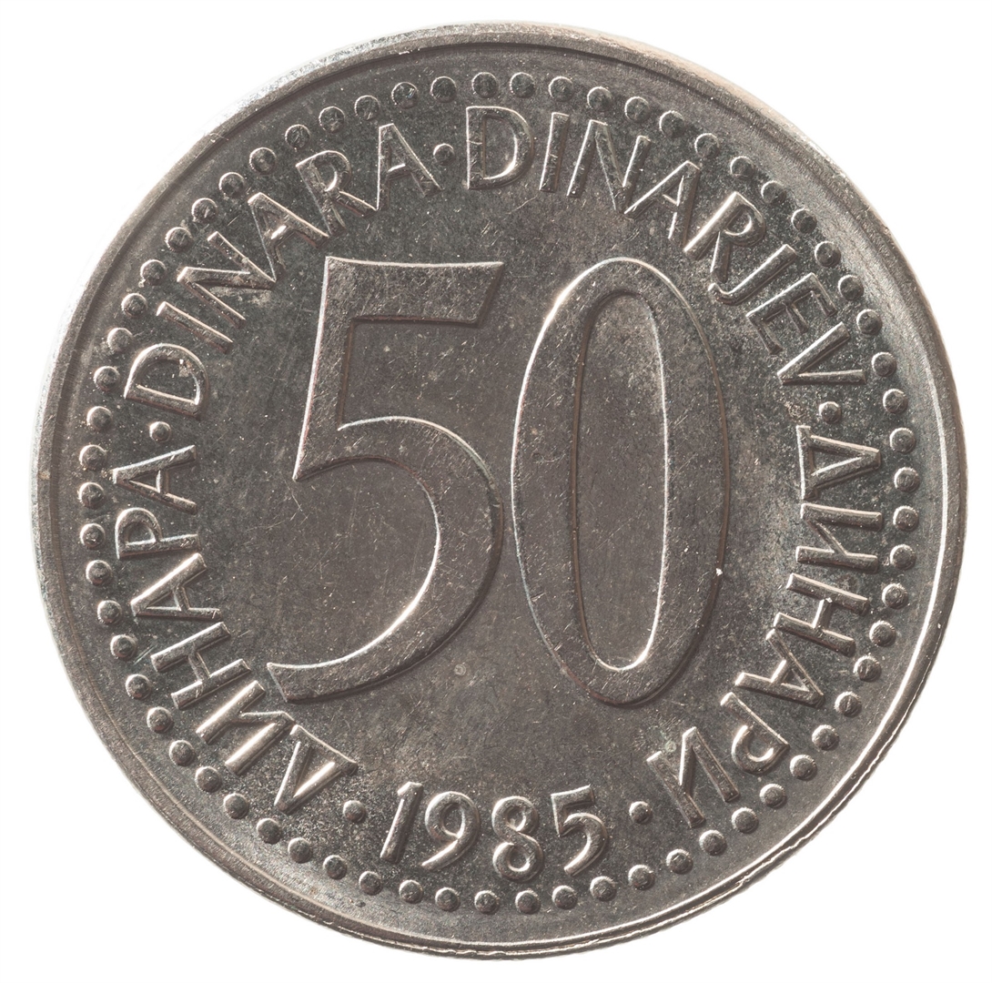U sredini broj 50 (nominala), oko njega tekst DINAR na četiri jezika, a ispod toga godina 1985.