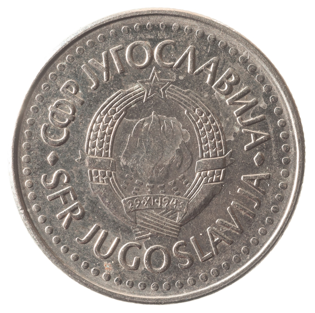 U sredini državni grb. Oko njega uz rub polukružno napisan tekst SFR JUGOSLAVIJA na latinici i ćirilici.