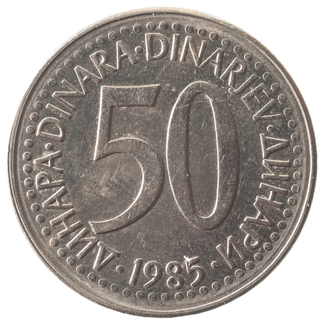 U sredini broj 50 (nominala), oko njega tekst DINAR na četiri jezika, a ispod toga godina 1985.