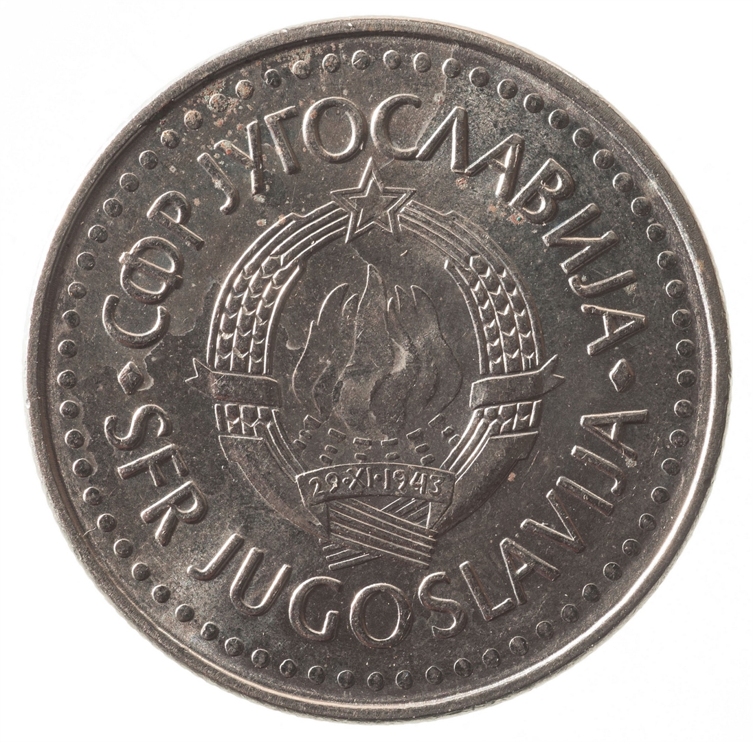 U sredini državni grb. Oko njega uz rub polukružno napisan tekst SFR JUGOSLAVIJA na latinici i ćirilici.