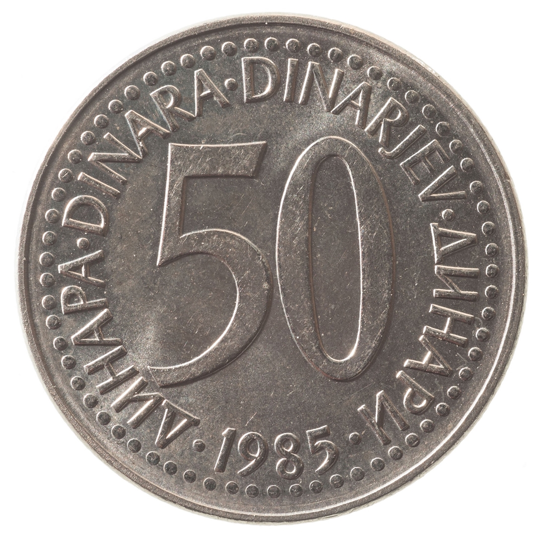 U sredini broj 50 (nominala), oko njega tekst DINAR na četiri jezika, a ispod toga godina 1985.