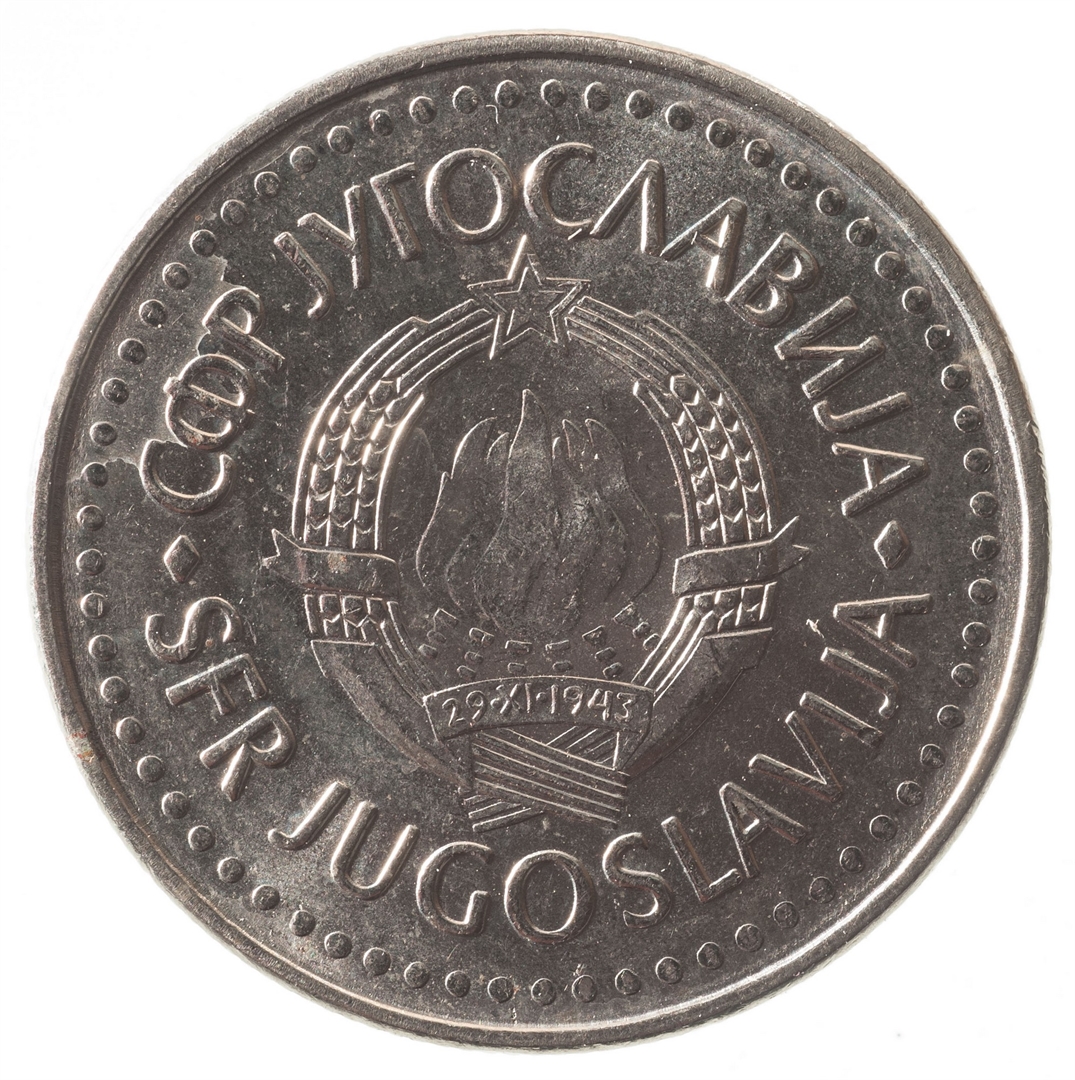 U sredini državni grb. Oko njega uz rub polukružno napisan tekst SFR JUGOSLAVIJA na latinici i ćirilici.