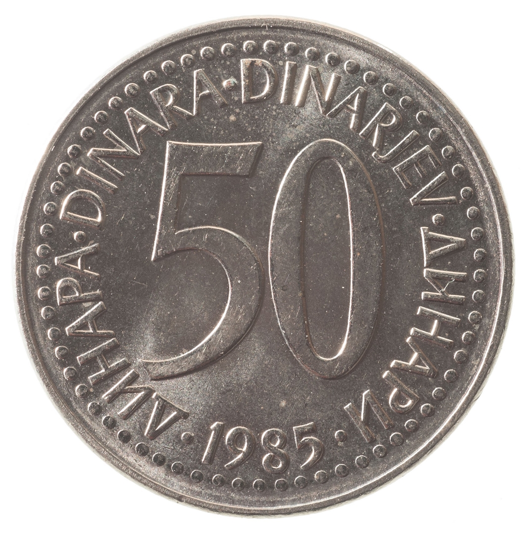 U sredini broj 50 (nominala), oko njega tekst DINAR na četiri jezika, a ispod toga godina 1985.