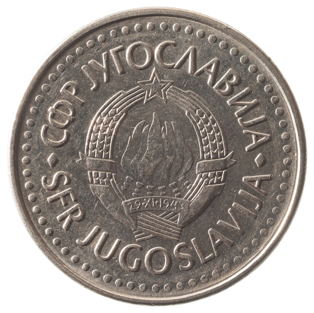 U sredini državni grb. Oko njega uz rub polukružno napisan tekst SFR JUGOSLAVIJA na latinici i ćirilici.