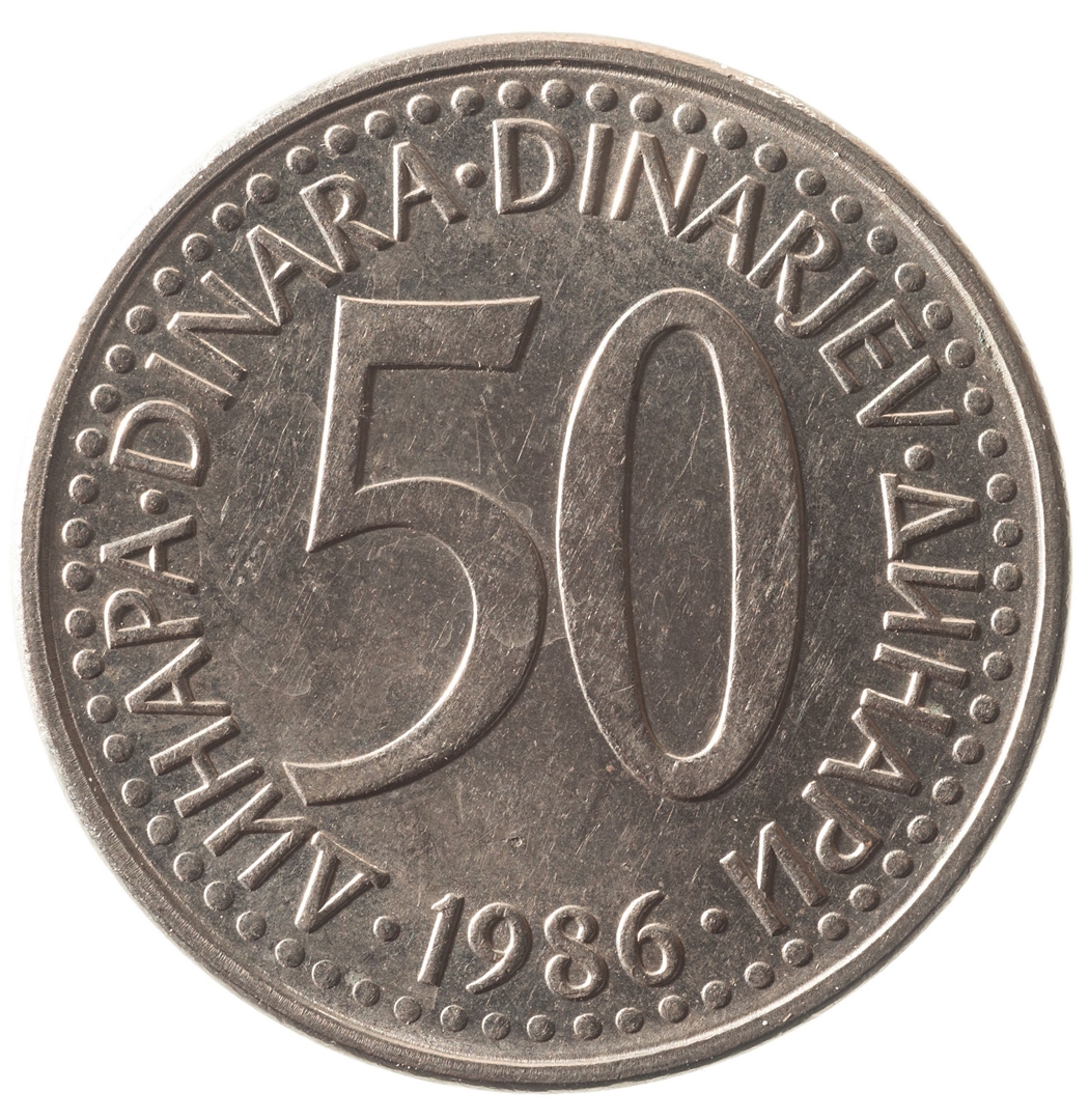 U sredini broj 50 (nominala), oko njega tekst DINAR na četiri jezika, a ispod toga godina 1986.
