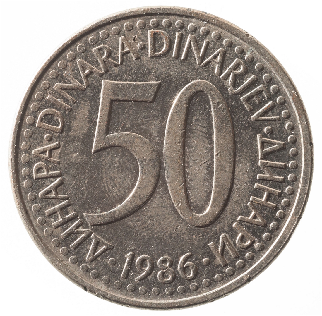 Avers: U sredini državni grb. Oko njega uz rub polukružno napisan tekst SFR JUGOSLAVIJA na latinici i ćirilici. Revers: U sredini broj 50 (nominala), oko njega tekst DINAR na četiri jezika, a ispod toga godina 1986.