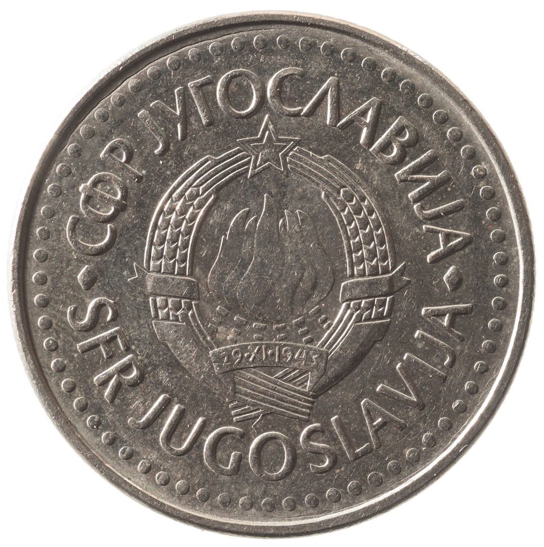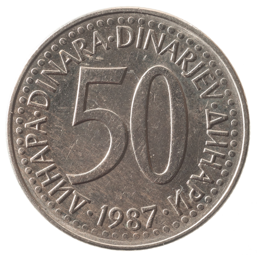 Avers: U sredini državni grb. Oko njega uz rub polukružno napisan tekst SFR JUGOSLAVIJA na latinici i ćirilici. Revers: U sredini broj 50 (nominala), oko njega tekst DINAR na četiri jezika, a ispod toga godina 1987.