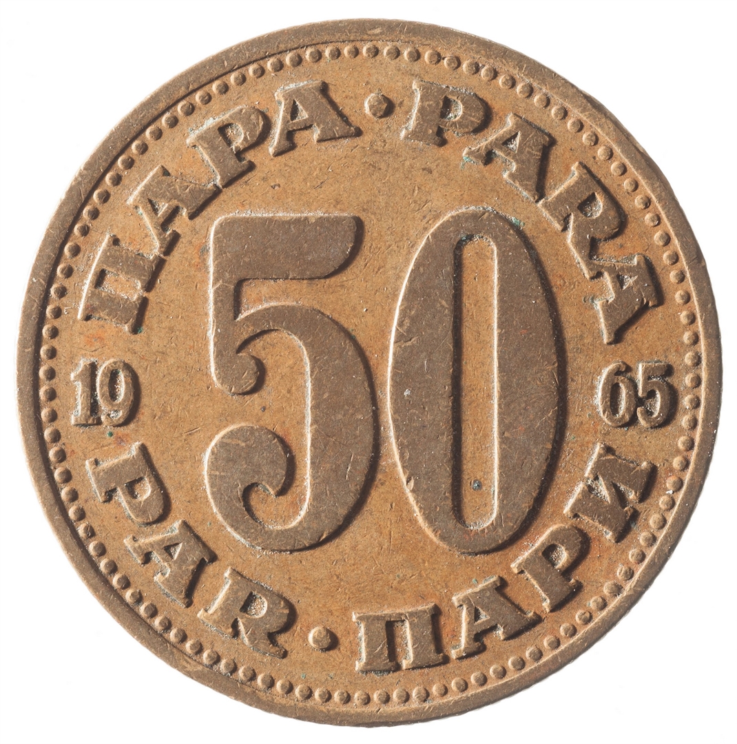 U sredini broj 50 (nominala), a oko njega tekst PARA na četiri jezika. U sredini uz lijevi i desni rub upisana godina 1965.