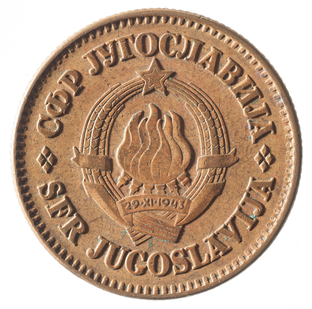 U sredini državni grb. U gornjem djelu uz rub polukružno napisan tekst SFR JUGOSLAVIJA na latinici i ćirilici.