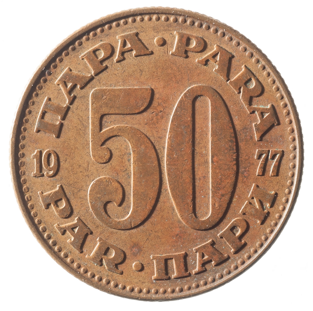 U sredini broj 50 (nominala), a oko njega tekst PARA na četiri jezika. U sredini uz lijevi i desni rub upisana godina 1977.