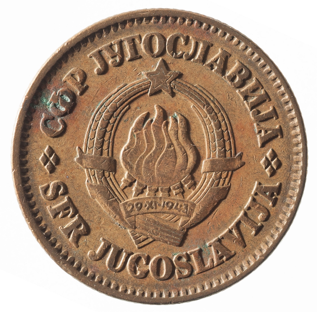 U sredini državni grb. U gornjem djelu uz rub polukružno napisan tekst SFR JUGOSLAVIJA na latinici i ćirilici.