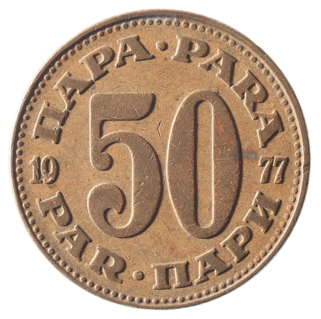 U sredini broj 50 (nominala), a oko njega tekst PARA na četiri jezika. U sredini uz lijevi i desni rub upisana godina 1977.