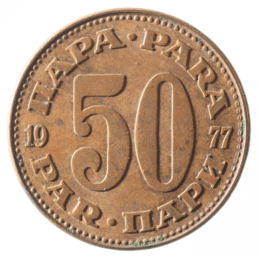 Avers: U sredini državni grb. U gornjem djelu uz rub polukružno napisan tekst SFR JUGOSLAVIJA na latinici i ćirilici. Revers: U sredini broj 50 (nominala), a oko njega tekst PARA na četiri jezika. U sredini uz lijevi i desni rub upisana godina 1977.