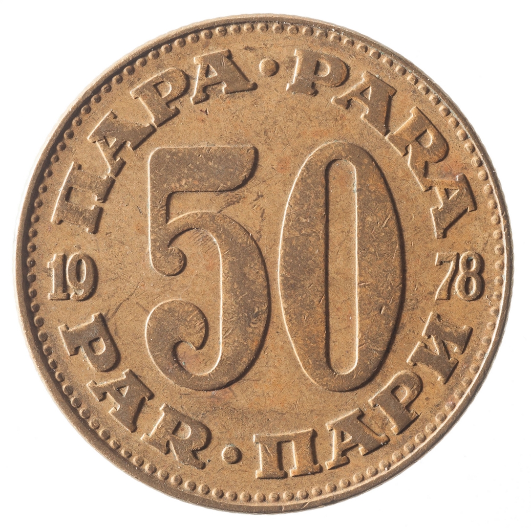 U sredini broj 50 (nominala), a oko njega tekst PARA na četiri jezika. U sredini uz lijevi i desni rub upisana godina 1978.