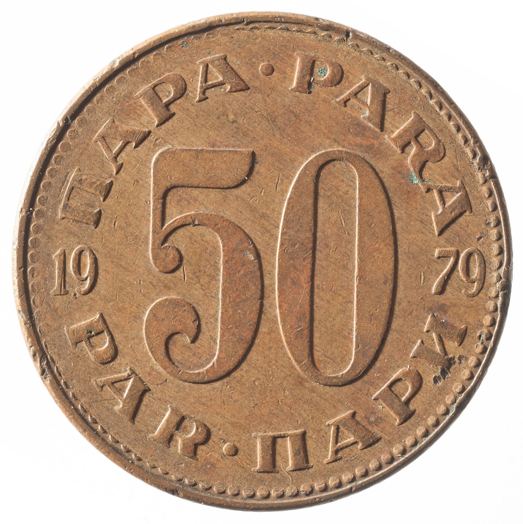 U sredini broj 50 (nominala), a oko njega tekst PARA na četiri jezika. U sredini uz lijevi i desni rub upisana godina 1979.