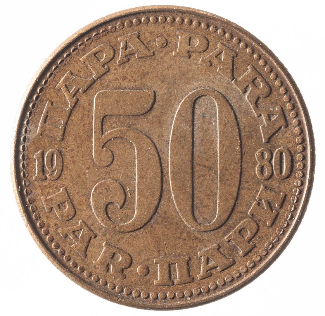 U sredini broj 50 (nominala), a oko njega tekst PARA na četiri jezika. U sredini uz lijevi i desni rub upisana godina 1980.