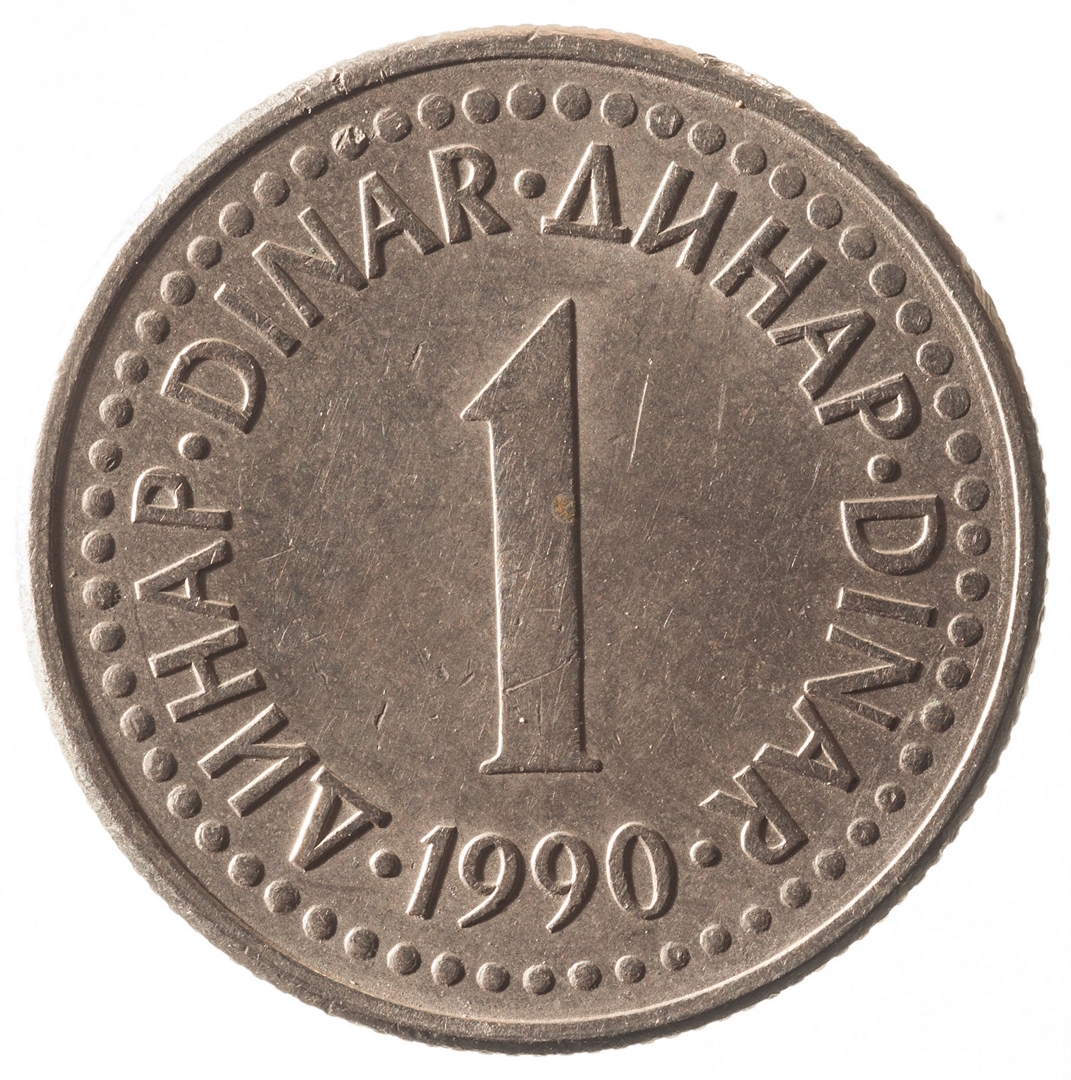 U sredini broj 1 (nominala), oko njega tekst DINAR na četiri jezika, a ispod toga godina 1990.