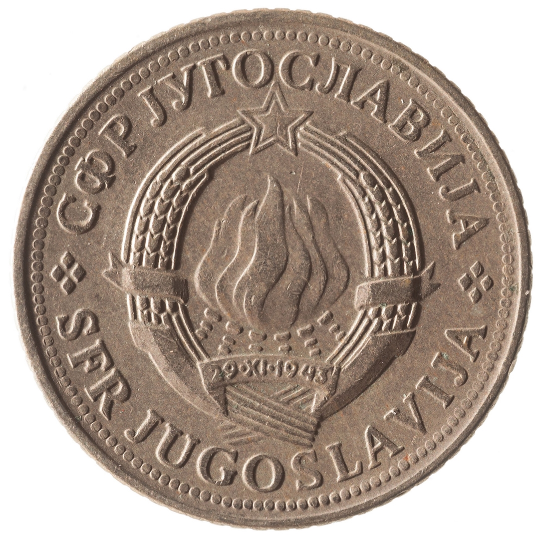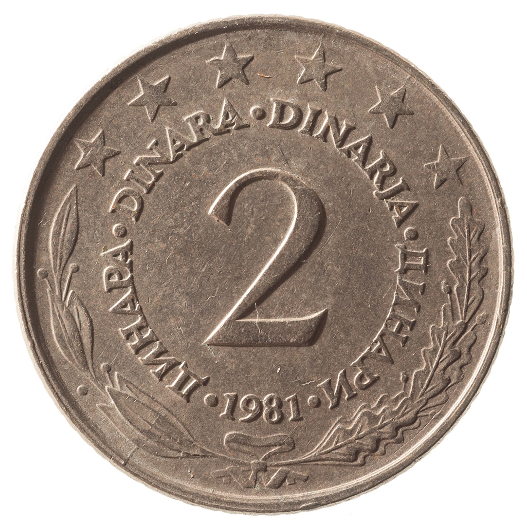 Avers: U sredini državni grb. U oko njega uz rub polukružno napisan tekst SFR JUGOSLAVIJA na latinici i ćirilici. Revers: U sredini broj 2 (nominala), oko njega tekst DINAR na četiri jezika, a ispod toga godina 1981. Duž gornjeg ruba polukružno poredano 6 petokrakih zvjezdi.