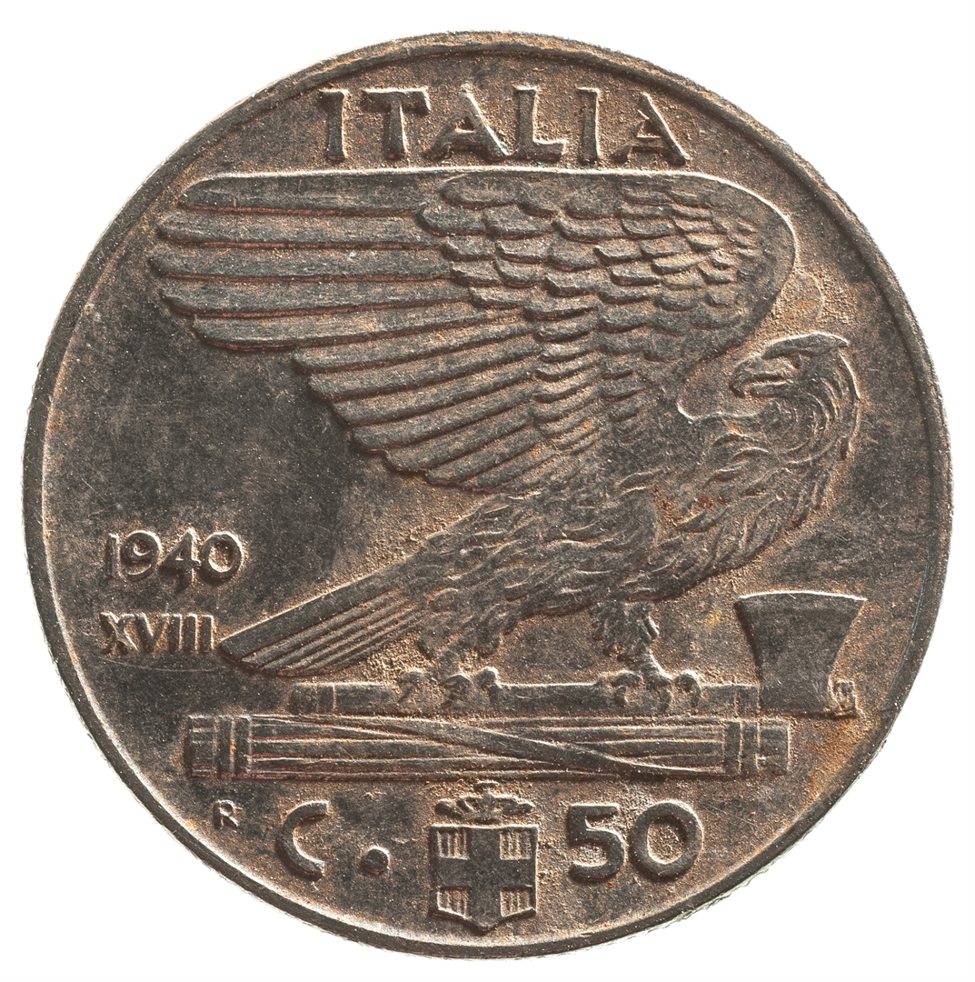 Centralni dio reversa zauzima prikaz orla raširenih krila koji u kanđama drži fascio. Iznad njega nalazi se natpis ITALIA, a sa njegove desne strane godina 1940 i rimski broj XVIII. U dnu na sredini nalazi se grb s čije se desne strane nalazi broj 50, a sa lijeve strane slovo C. Lijevo od slova C nalazi se malo slovo R.