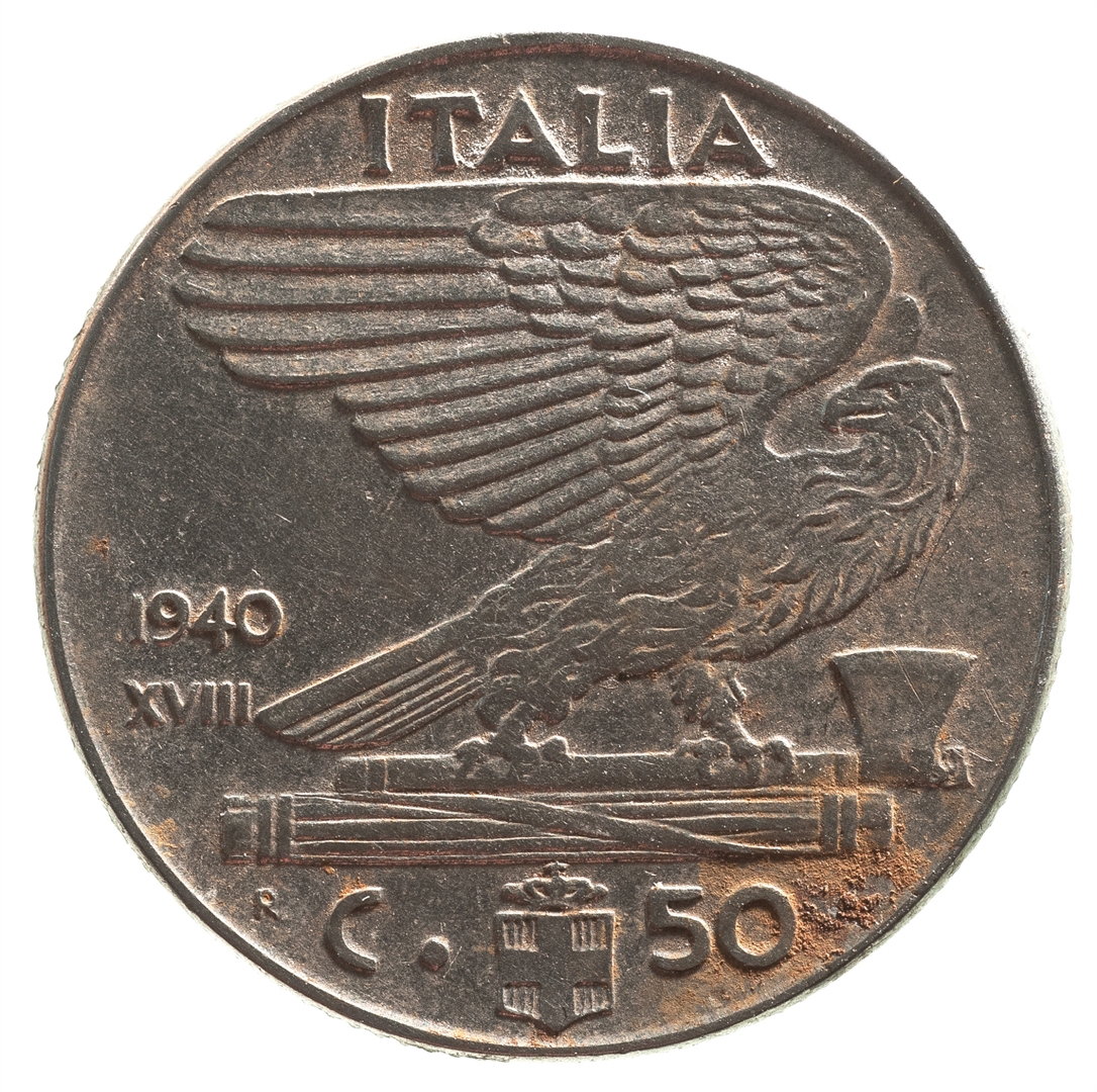 Centralni dio reversa zauzima prikaz orla raširenih krila koji u kanđama drži fascio. Iznad njega nalazi se natpis ITALIA, a sa njegove desne strane godina 1940 i rimski broj XVIII. U dnu na sredini nalazi se grb s čije se desne strane nalazi broj 50, a sa lijeve strane slovo C. Lijevo od slova C nalazi se malo slovo R.