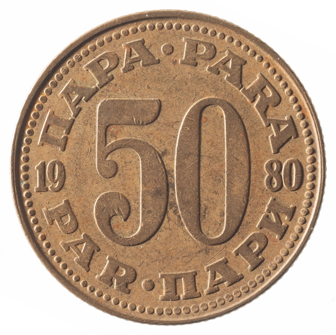 U sredini broj 50 (nominala), a oko njega tekst PARA na četiri jezika. U sredini uz lijevi i desni rub upisana godina 1980.
