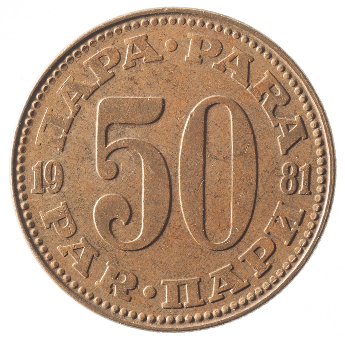 U sredini broj 50 (nominala), a oko njega tekst PARA na četiri jezika. U sredini uz lijevi i desni rub upisana godina 1981.